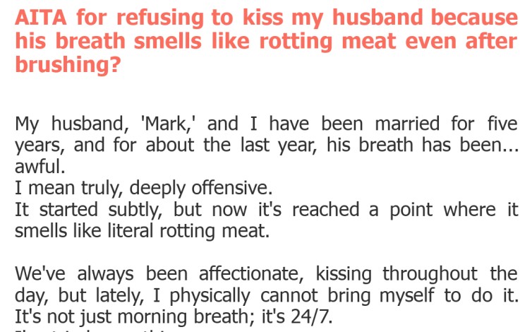 "AITA for refusing to kiss my husband because his breath smells like rotting meat even after brushing?"