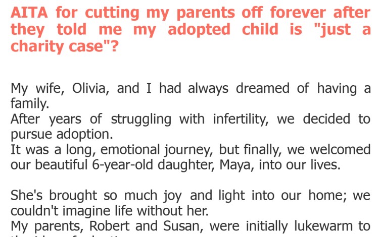 "AITA for cutting my parents off forever after they told me my adopted child is "just a charity case"?"