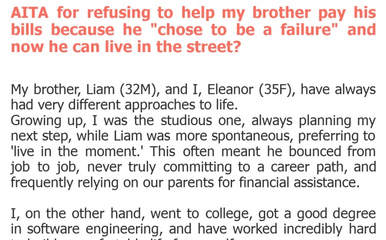 Welcome back, drama lovers! Today we're diving into a tale that many of us can relate to: the complex dynamics of sibling relationships when money is involved. Our submitter, Eleanor, finds herself at a crossroads with her brother, Liam. It's a classic situation where one sibling has consistently made less-than-ideal choices, and the other has worked tirelessly to build a stable life.