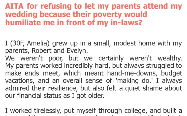 "AITA for refusing to let my parents attend my wedding because their poverty would humiliate me in front of my in-laws?"