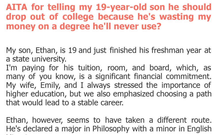 "AITA for telling my 19-year-old son he should drop out of college because he's wasting my money on a degree he'll never use?"