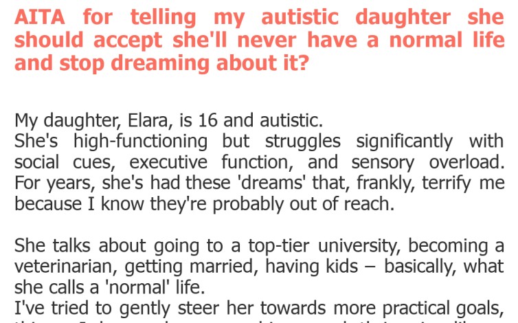 This post delves into a profoundly sensitive area, and it's clear the original poster (OP) is grappling with intense parental anxiety. On one hand, the desire to protect a child from future disappointment is a universal parental instinct. OP's past experiences with Elara's struggles and subsequent heartache undoubtedly inform her current stance, stemming from a place of fear for her daughter's well-being.\nHowever, the phrasing used – "accept you'll never have a normal life and stop dreaming about it" – is undeniably harsh and potentially devastating. While the intention might have been to introduce realism, the words likely landed as a direct attack on Elara's hopes, self-worth, and potential. There's a critical difference between guiding a child towards realistic paths and extinguishing their right to dream entirely, regardless of their neurotype.\nFor an autistic individual, navigating a neurotypical world already presents unique challenges. To then have a parent, a primary source of support and encouragement, declare their aspirations "fantasy" can be incredibly damaging. The concept of a "normal life" itself is fluid and subjective; many autistic individuals find immense fulfillment in unique ways, often achieving great things when given the right support and belief.\nInstead of shutting down dreams, a more constructive approach might involve exploring what those dreams truly mean to Elara. Perhaps her "normal life" looks different from a neurotypical one, but is equally valid. Offering guidance, resources, and support to adapt goals or find alternative paths, rather than dismissing them outright, fosters resilience and self-advocacy. This conversation, while necessary, needed a foundation of empathy, not frustration.