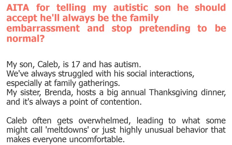 AITA for telling my autistic son he should accept he’ll always be the family embarrassment and stop pretending to be normal?