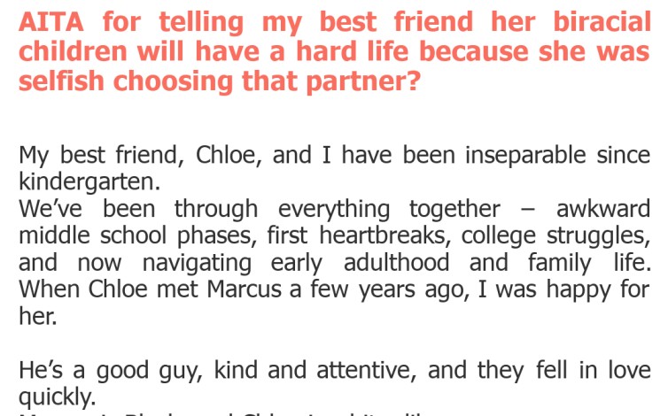 "AITA for telling my best friend her biracial children will have a hard life because she was selfish choosing that partner?"