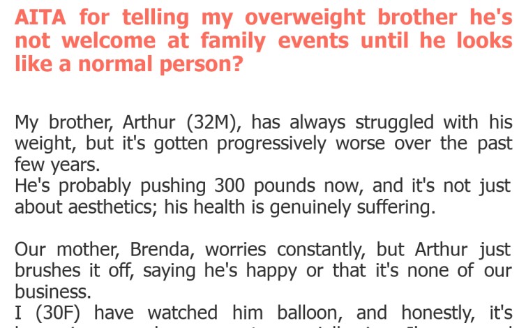 "AITA for telling my overweight brother he's not welcome at family events until he looks like a normal person?"