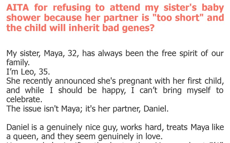 AITA for refusing to attend my sister’s baby shower because her partner is “too short” and the child will inherit bad genes?