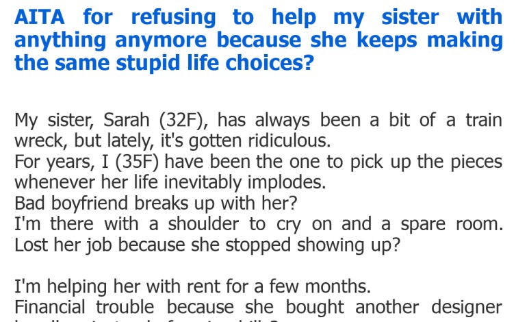 "AITA for refusing to help my sister with anything anymore because she keeps making the same stupid life choices?"