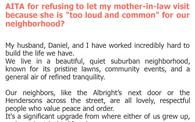 "AITA for refusing to let my mother-in-law visit because she is "too loud and common" for our neighborhood?"