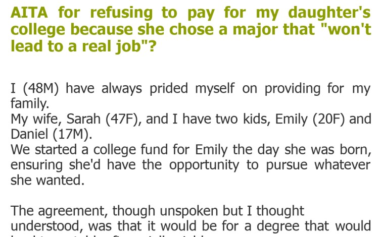 "AITA for refusing to pay for my daughter's college because she chose a major that "won't lead to a real job"?"