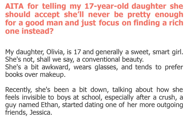 "AITA for telling my 17-year-old daughter she should accept she’ll never be pretty enough for a good man and just focus on finding a rich one instead?"