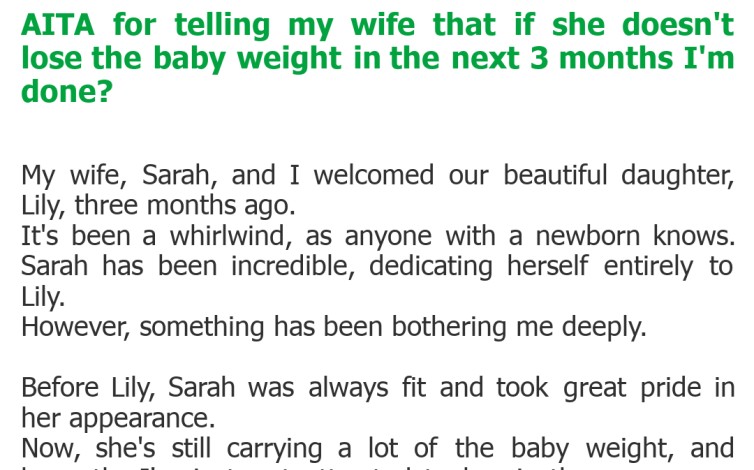 Welcome back to AITA Insights, where we dive deep into the internet's most divisive dilemmas. Today's submission is guaranteed to ignite a fiery debate, touching upon sensitive subjects of body image, marital expectations, and the challenging journey of parenthood. When a partner issues an ultimatum, especially one involving physical appearance after childbirth, it rarely ends well for anyone involved.