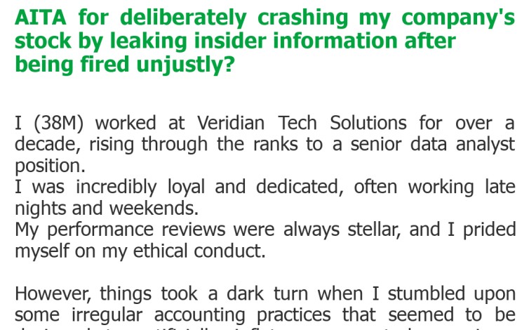 AITA for deliberately crashing my company’s stock by leaking insider information after being fired unjustly?