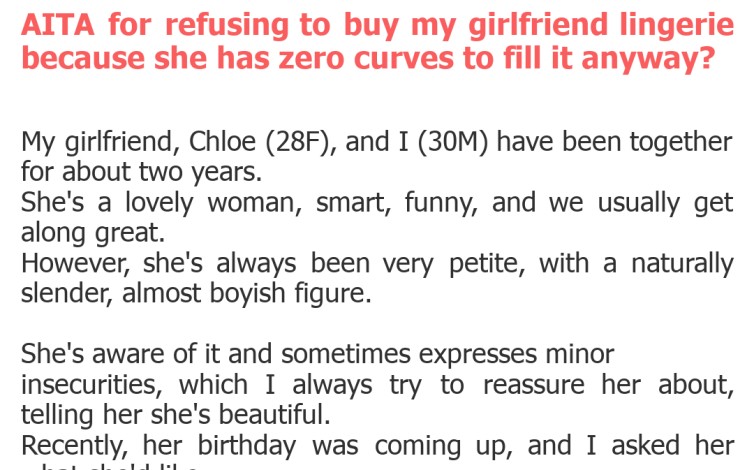 "AITA for refusing to buy my girlfriend lingerie because she has zero curves to fill it anyway?"