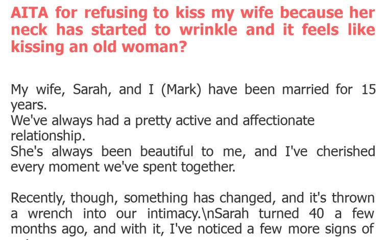 Oh, the complexities of long-term relationships! Today, we're diving into a story that touches on a sensitive topic many couples eventually face: the impact of physical changes and aging on intimacy. It's easy to say 'looks don't matter,' but for some, the reality can be a challenging hurdle, leading to uncomfortable conversations and deeply hurt feelings.\nOur letter sender, Mark, is grappling with his wife Sarah's natural aging process. Specifically, he's found himself recoiling from physical affection due to newfound wrinkles on her neck. This isn't just about superficiality; it delves into attraction, respect, and the often unspoken expectations within a marriage. Let's unpack this delicate situation together and see what the community has to say.