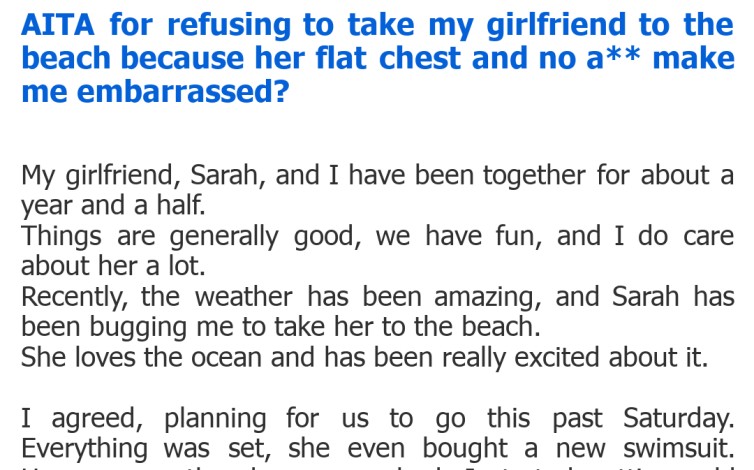 "AITA for refusing to take my girlfriend to the beach because her flat chest and no a** make me embarrassed?"