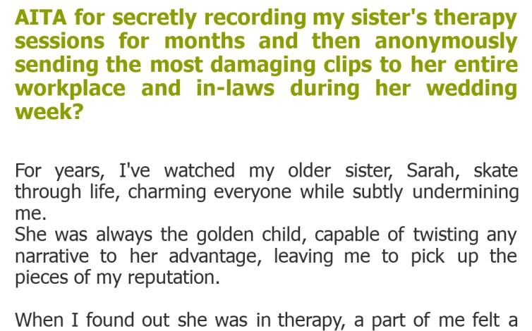 "AITA for secretly recording my sister's therapy sessions for months and then anonymously sending the most damaging clips to her entire workplace and in-laws during her wedding week?"