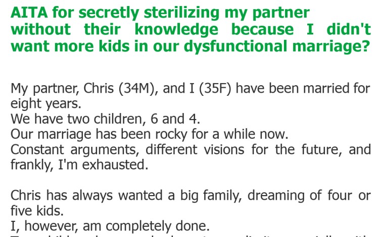 "AITA for secretly sterilizing my partner without their knowledge because I didn't want more kids in our dysfunctional marriage?"