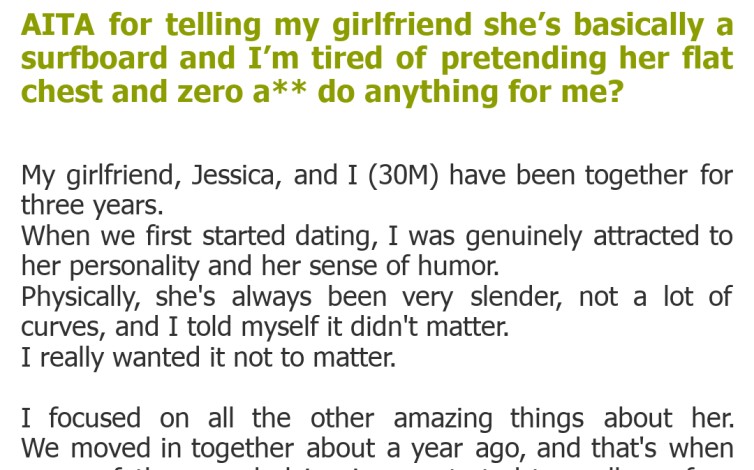 "AITA for telling my girlfriend she’s basically a surfboard and I’m tired of pretending her flat chest and zero a** do anything for me?"