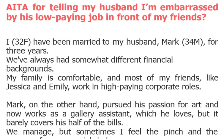"AITA for telling my husband I’m embarrassed by his low-paying job in front of my friends?"