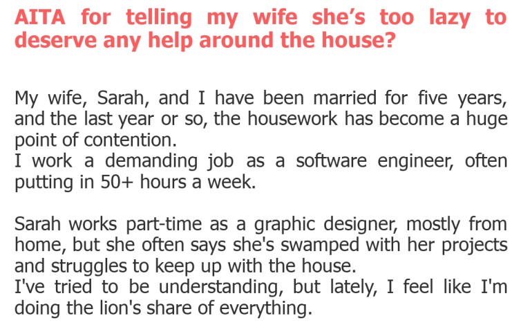"AITA for telling my wife she’s too lazy to deserve any help around the house?"