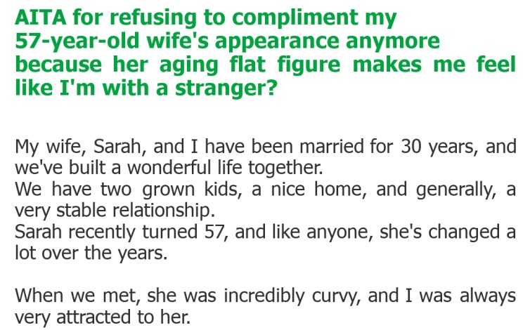 AITA for refusing to compliment my 57-year-old wife’s appearance anymore because her aging flat figure makes me feel like I’m with a stranger?