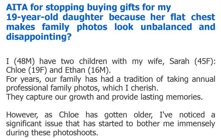 "AITA for stopping buying gifts for my 19-year-old daughter because her flat chest makes family photos look unbalanced and disappointing?"