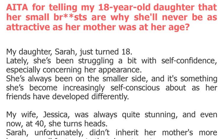 "AITA for telling my 18-year-old daughter that her small br**sts are why she'll never be as attractive as her mother was at her age?"