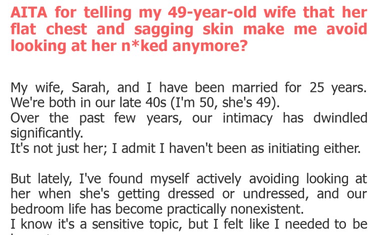 "AITA for telling my 49-year-old wife that her flat chest and sagging skin make me avoid looking at her n*ked anymore?"