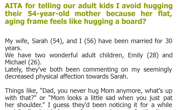 "AITA for telling our adult kids I avoid hugging their 54-year-old mother because her flat, aging frame feels like hugging a board?"