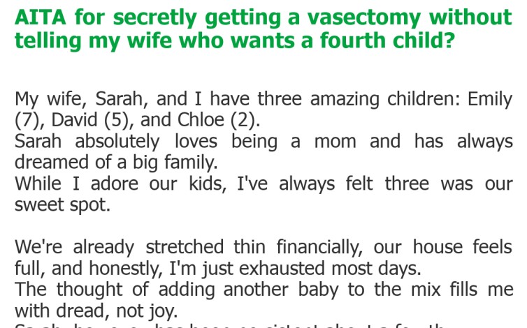 "AITA for secretly getting a vasectomy without telling my wife who wants a fourth child?"