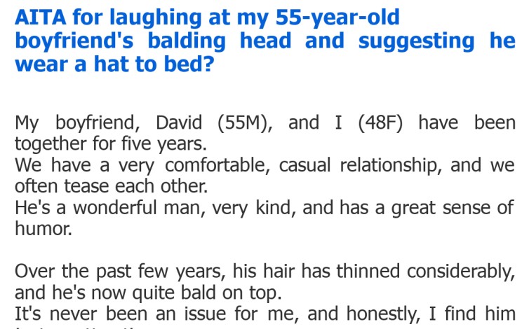 AITA for laughing at my 55-year-old boyfriend’s balding head and suggesting he wear a hat to bed?