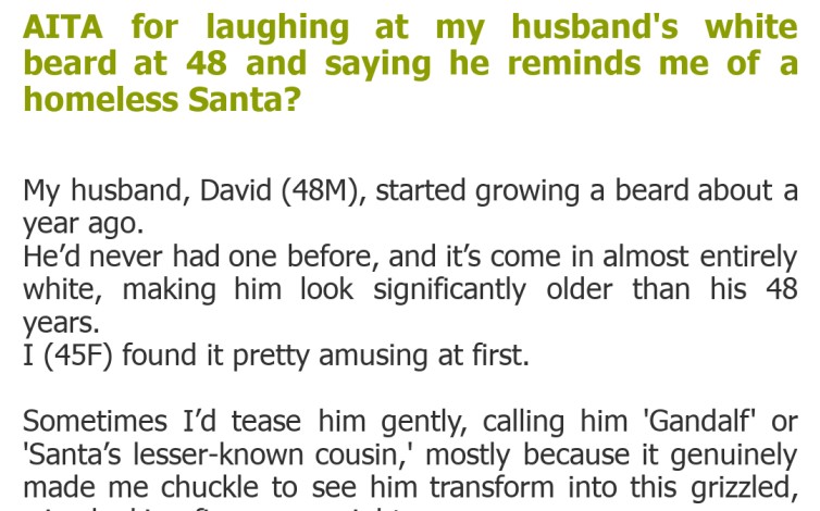 "AITA for laughing at my husband's white beard at 48 and saying he reminds me of a homeless Santa?"