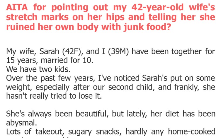 "AITA for pointing out my 42-year-old wife's stretch marks on her hips and telling her she ruined her own body with junk food?"