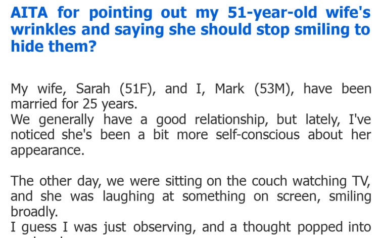 "AITA for pointing out my 51-year-old wife's wrinkles and saying she should stop smiling to hide them?"