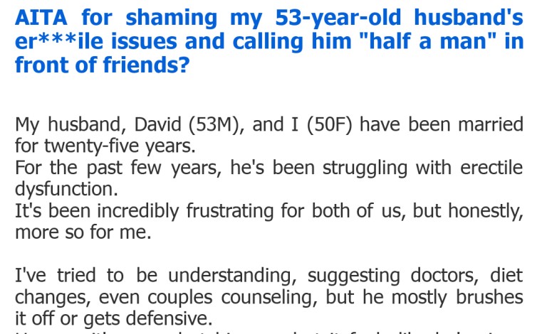 "AITA for shaming my 53-year-old husband's er***ile issues and calling him "half a man" in front of friends?"