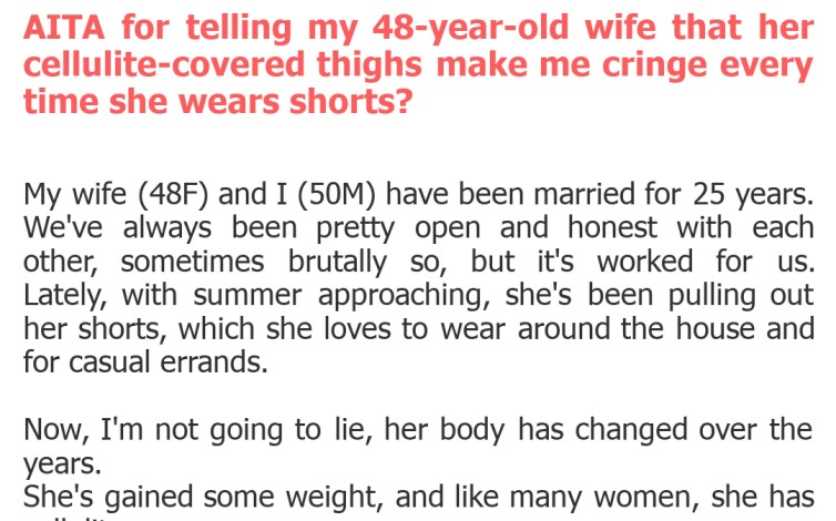 "AITA for telling my 48-year-old wife that her cellulite-covered thighs make me cringe every time she wears shorts?"