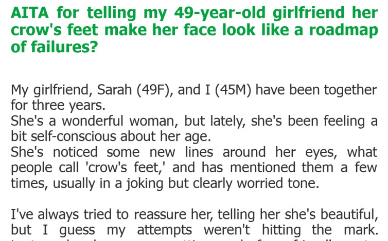 "AITA for telling my 49-year-old girlfriend her crow's feet make her face look like a roadmap of failures?"