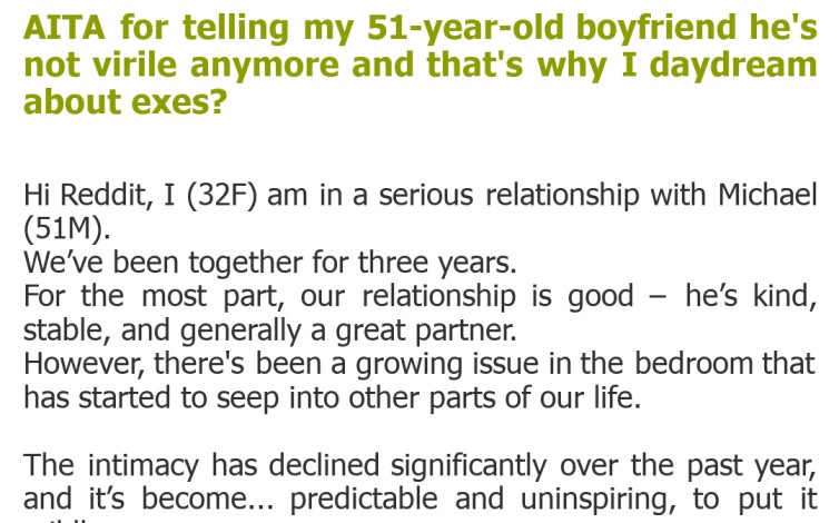 "AITA for telling my 51-year-old boyfriend he's not virile anymore and that's why I daydream about exes?"