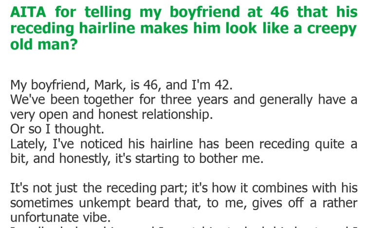"AITA for telling my boyfriend at 46 that his receding hairline makes him look like a creepy old man?"