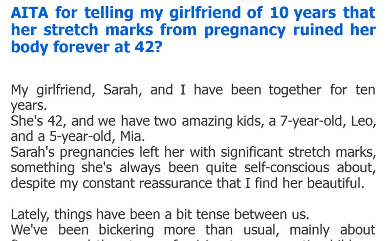 "AITA for telling my girlfriend of 10 years that her stretch marks from pregnancy ruined her body forever at 42?"