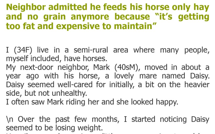 Oh, neighbors! Sometimes they're the best, bringing over cookies and borrowing sugar. Other times, they can present you with a truly thorny ethical dilemma, especially when the well-being of an animal is involved. It’s one thing to disagree on lawn maintenance, but when it comes to the basic needs of a living creature, the lines can get incredibly blurry and tensions can run high. \n This week, we're diving into a story that pits neighborly peace against animal welfare, highlighting the difficult choices people face when they witness potential neglect. Our original poster, 'Concerned_Equestrian,' found themselves in a truly uncomfortable position after a casual conversation revealed some alarming details about their neighbor's approach to horse care. Grab your virtual pitchforks, or maybe just a thoughtful cup of tea, and let's dissect this one together.