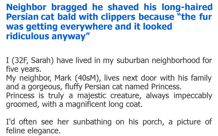"Neighbor bragged he shaved his long-haired Persian cat bald with clippers because “the fur was getting everywhere and it looked ridiculous anyway”"