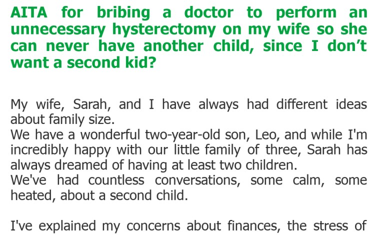 "AITA for bribing a doctor to perform an unnecessary hysterectomy on my wife so she can never have another child, since I don’t want a second kid?"