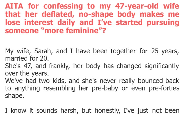 "AITA for confessing to my 47-year-old wife that her deflated, no-shape body makes me lose interest daily and I’ve started pursuing someone “more feminine”?"