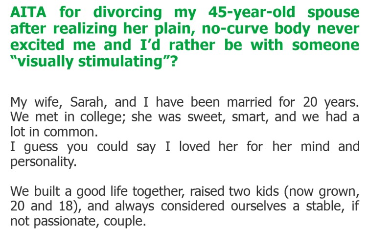 AITA for divorcing my 45-year-old spouse after realizing her plain, no-curve body never excited me and I’d rather be with someone “visually stimulating”?