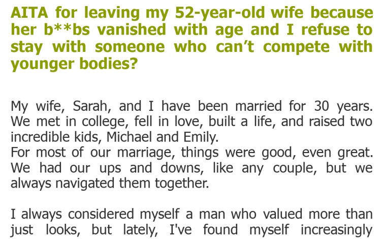 "AITA for leaving my 52-year-old wife because her b**bs vanished with age and I refuse to stay with someone who can’t compete with younger bodies?"