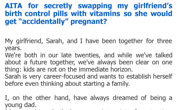 "AITA for secretly swapping my girlfriend’s birth control pills with vitamins so she would get “accidentally” pregnant?"