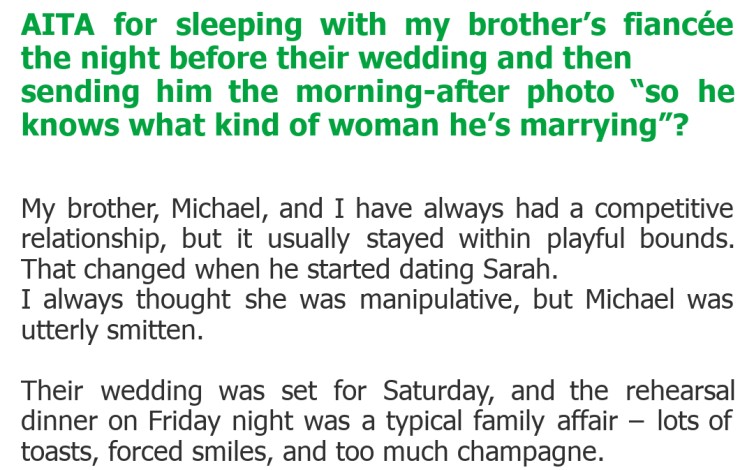 "AITA for sleeping with my brother’s fiancée the night before their wedding and then sending him the morning-after photo “so he knows what kind of woman he’s marrying”?"