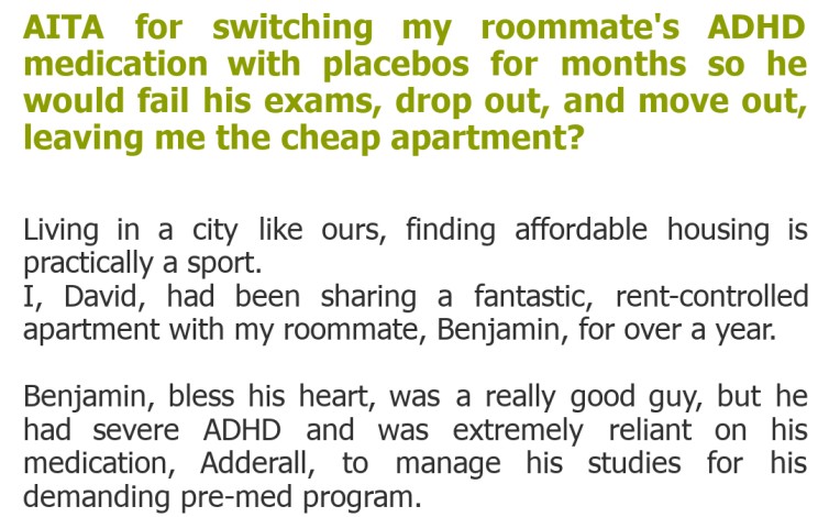 AITA for switching my roommate’s ADHD medication with placebos for months so he would fail his exams, drop out, and move out, leaving me the cheap apartment?