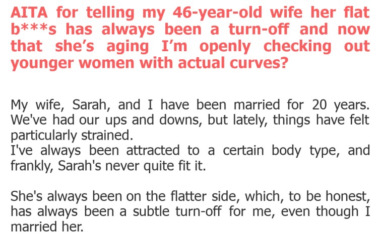 "AITA for telling my 46-year-old wife her flat b***s has always been a turn-off and now that she’s aging I’m openly checking out younger women with actual curves?"